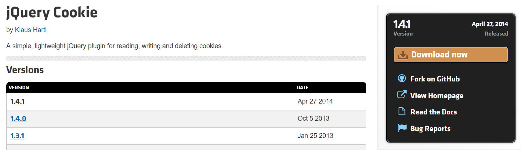 jQuery Cookie by Klaus Hartl A simple, lightweight jQuery plugin for reading, writing and deleting cookies. Versions Version Date 1.4.1 Apr 27 2014 1.4.0 Oct 5 2013 1.3.1 Jan 25 2013 1.3.0 Jan 24 2013
